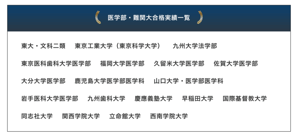 実績面でも、東京大学・東京科学大学(旧:東京工業大学)・九州大学・国立医学部・私立医学部・早慶上智など、難関大学への合格者を多数輩出、過去問分析と弱点補強を組み合わせた独自メソッドにより、基礎から応用まで無理なく定着します。
