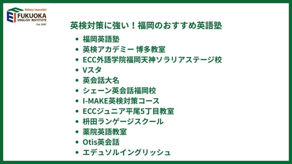 福岡には、英検に特化したカリキュラムを提供する実績豊富な塾が多数あります。